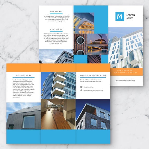Design sleek tri fold brochures with standout property images, essential contact details, and space to highlight key property features. Impress potential buyers and sellers with a real estate brochure.