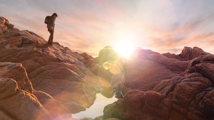 Woman in yellow jacket admiring mountains with cool-toned lens flare in the sky Person standing on a rocky cliff at sunset with dramatic lens flare effect Editing a photo of a woman in red dress using BeFunky’s lens flare tool in UI view Young girl standing under a flowering tree with soft lens flare filtering through leaves lens flare effect on photo of horse running