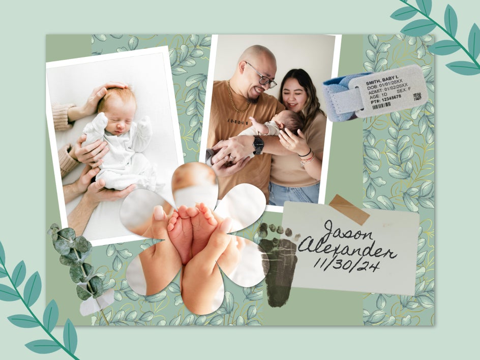 Tell a story by creating a multimedia digital scrapbook page to announce the birth. This gives your card a more handmade feeling and allows you to show off additional details like handprints, footprints, and mementos.