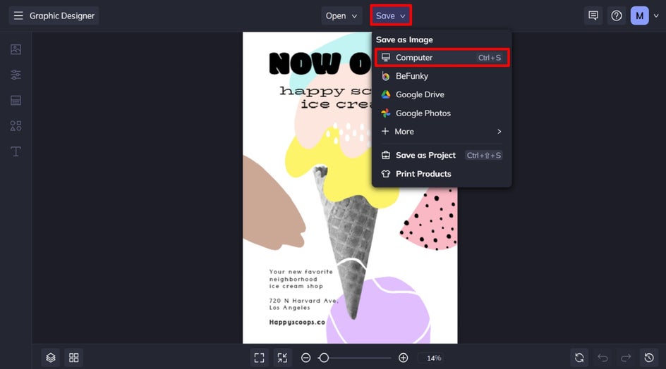 Once you're doing creating in the Photo Editor, Graphic Designer, or Collage Maker, click Save at the top of the screen, followed by Computer.