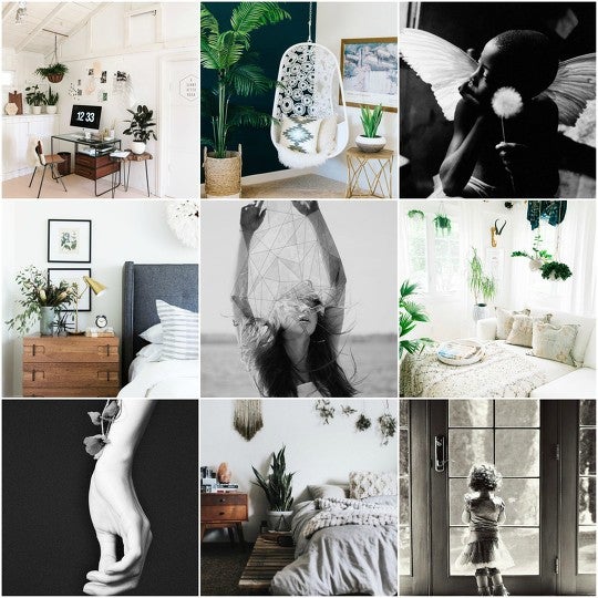 Collage, bohemian bedroom with black and white prints.