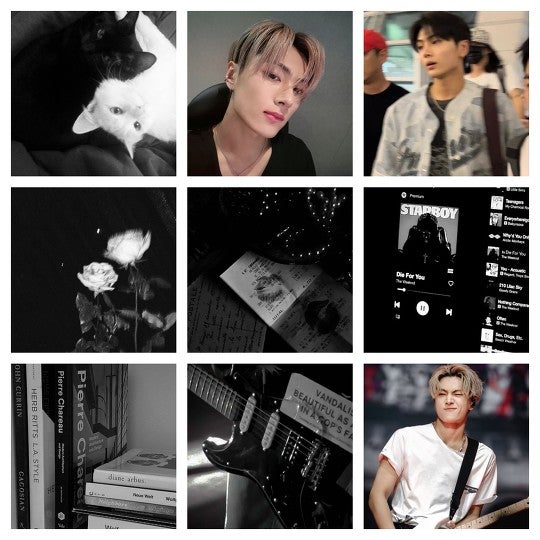 Illustration of collage maker interface showing a cursor selecting an image within a grid layout, depicted in pink and blue tones.