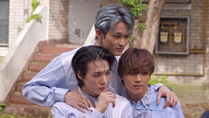 Diagram of step by step process flow with arrows connecting video, image, and text elements, in pink and blue tones.