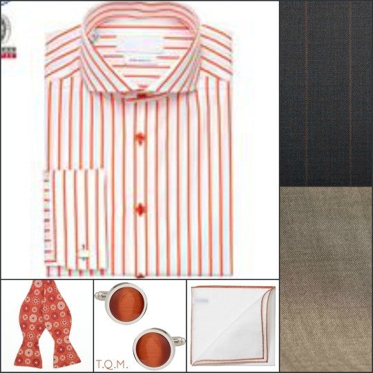 SHIRTTIE COMBO Warhouse(Shirt)-Christopher Schafer(Bowtie)-Unknown(Cufflinks)-Simonnot(Pocket Square)-Suggested Suit Colors(Gray wOrange Str