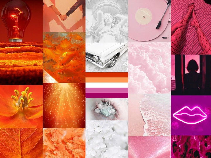 Illustration of collage maker interface showing a cursor selecting an image within a grid layout, depicted in pink and blue tones.
