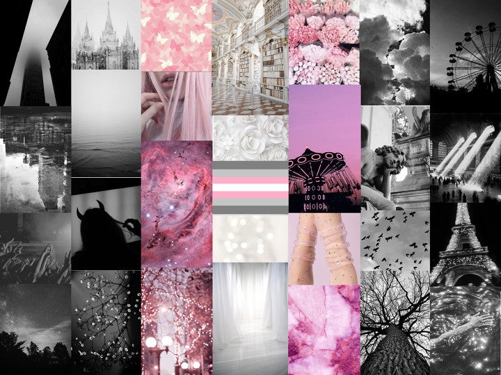 Illustration of collage maker interface showing a cursor selecting an image within a grid layout, depicted in pink and blue tones.