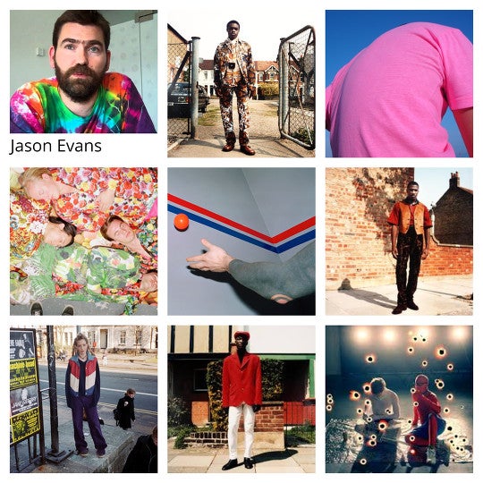 Illustration of collage maker interface showing a cursor selecting an image within a grid layout, depicted in pink and blue tones.