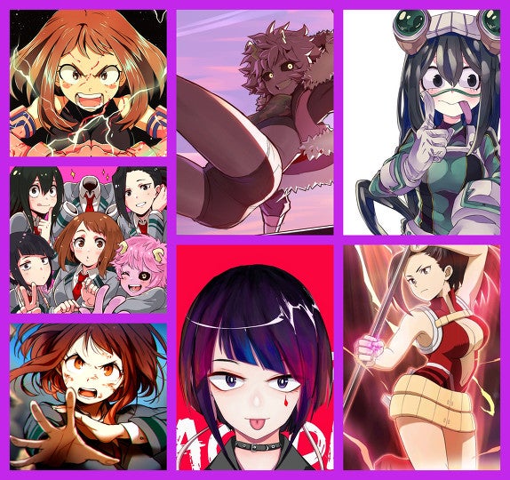 Illustration of collage maker interface showing a cursor selecting an image within a grid layout, depicted in pink and blue tones.