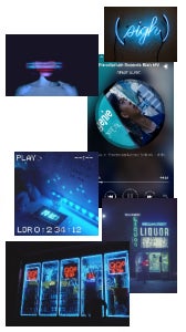 Illustration of a dashboard with a grid of images and text lists, depicted in cyan and blue tones.