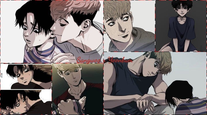 Illustration of collage maker interface showing a cursor selecting an image within a grid layout, depicted in pink and blue tones.