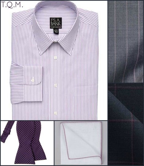 SHIRTTIE COMBO Jos A. Banks(Shirt)-Reteeze(Bowtie)-Pelikamo(Pocket Square)-Suggested Suit Colors(Gray wPurple Stripes & Blue wPurple Windowp