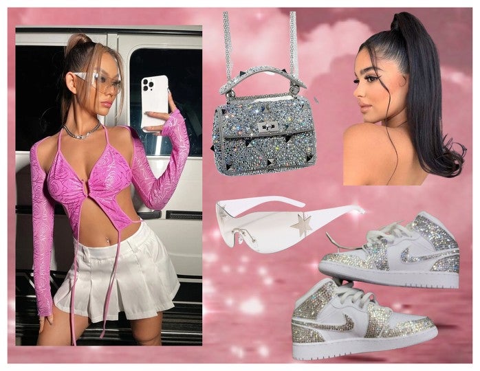 Illustration of collage maker interface showing a cursor selecting an image within a grid layout, depicted in pink and blue tones.