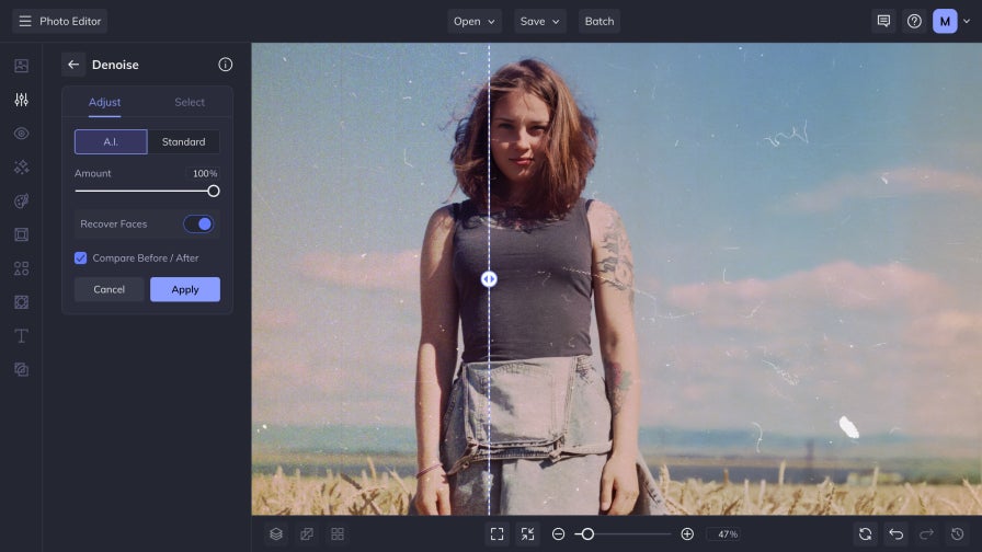 With BeFunky's AI Denoiser, it's easy to bring clarity back to your photos in a single click.
