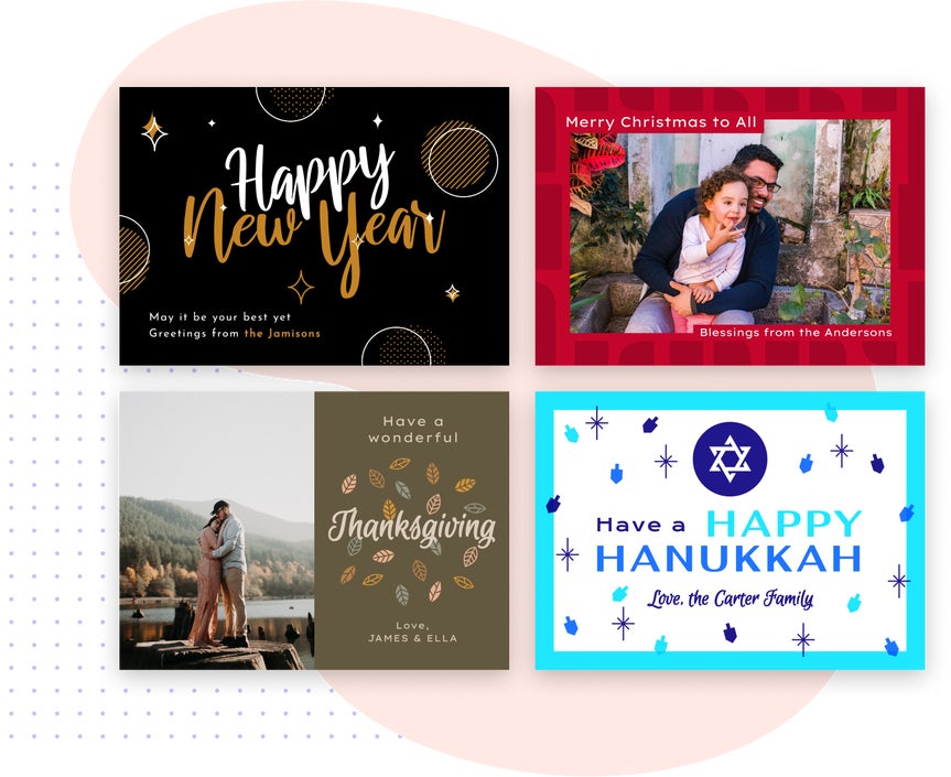 BeFunky’s holiday card templates cover a wide range of celebrations, including Christmas, Hanukkah, Diwali, New Year’s, and more. Each template blends modern layouts with festive graphics and seasonal color palettes. Whether you’re creating a traditional greeting or something unique to your family’s style, you’ll find templates for nearly every holiday to share your message beautifully and effortlessly.