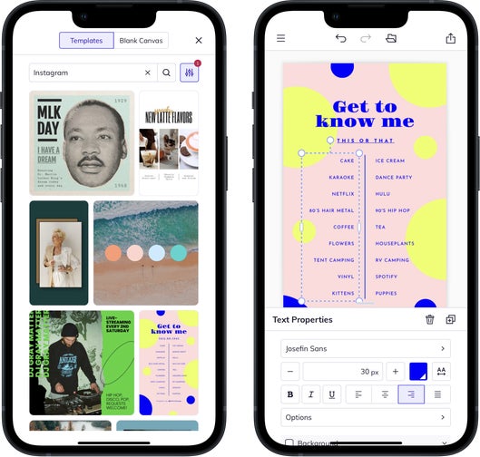Create standout Instagram content with every tool you need in one place. With the Graphic Designer, Collage Maker, and Photo Editor in the same streamlined workspace, you can move from layout to editing and back again without missing a beat. Customize templates or collage layouts built for image-focused posts and Stories by enhancing photos, removing backgrounds, and more – without switching tabs. Whether you're sharing Stories or updating your grid, you'll have everything to go from idea to posting in seconds.