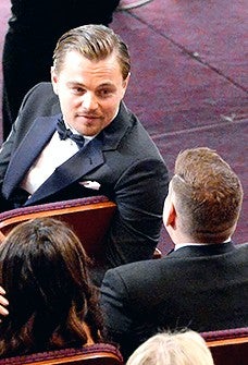 Leonardo DiCaprio talking during a commercial break at the 2014 Oscars