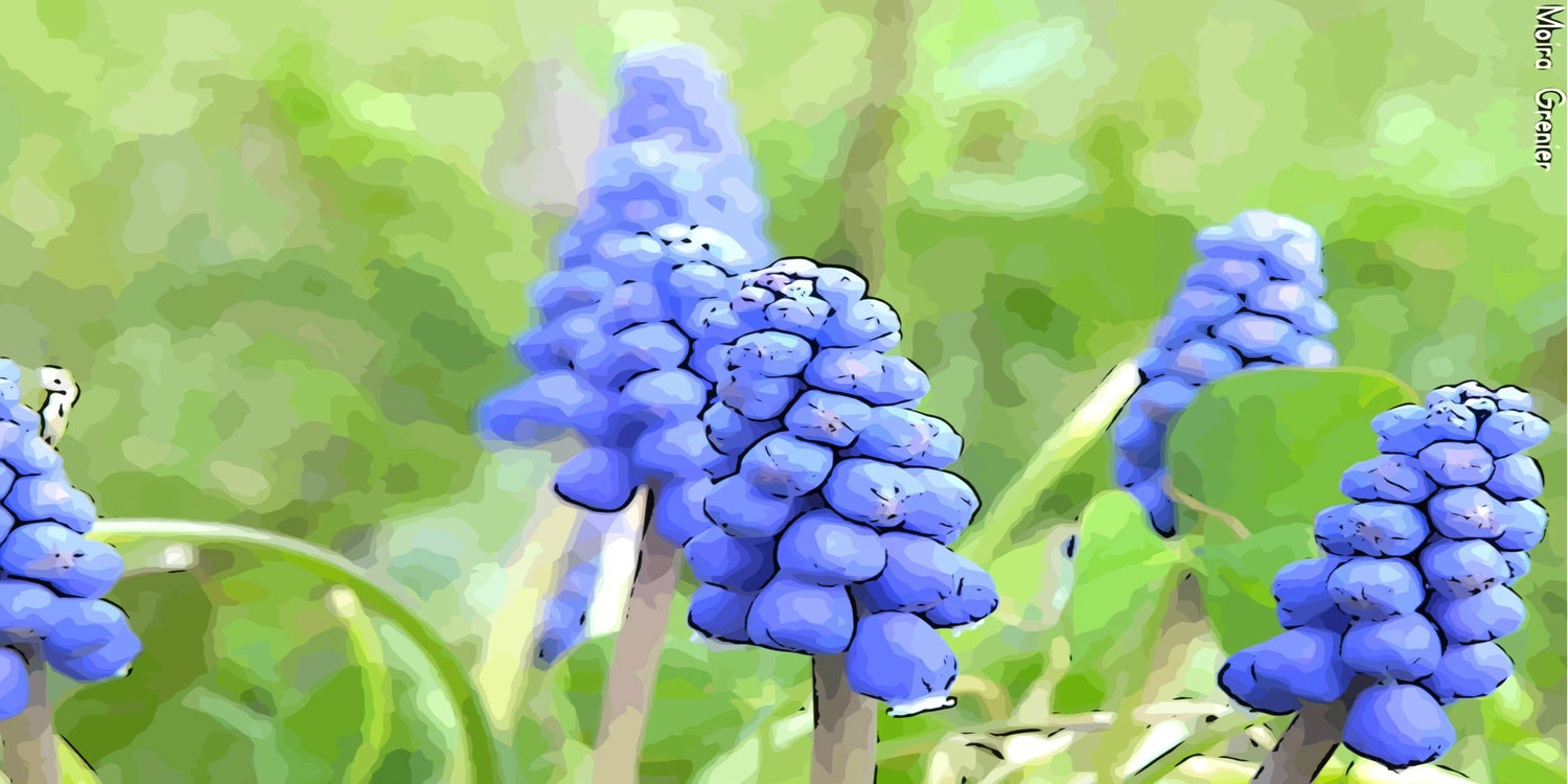 Illustration of collage maker interface showing a cursor selecting an image within a grid layout, depicted in pink and blue tones.
