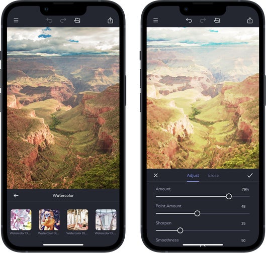 With unparalleled results, Watercolor GFX is our most realistic watercolor filter yet. With GFX, you can customize how closely the effect resembles your original photo – without losing detail or adding distortion to serene landscapes, pet photos, and more. You'll also have the option to choose from several different variations. But no matter your choice, expect extreme accuracy, airy brushstrokes, and the perfect color bleed.