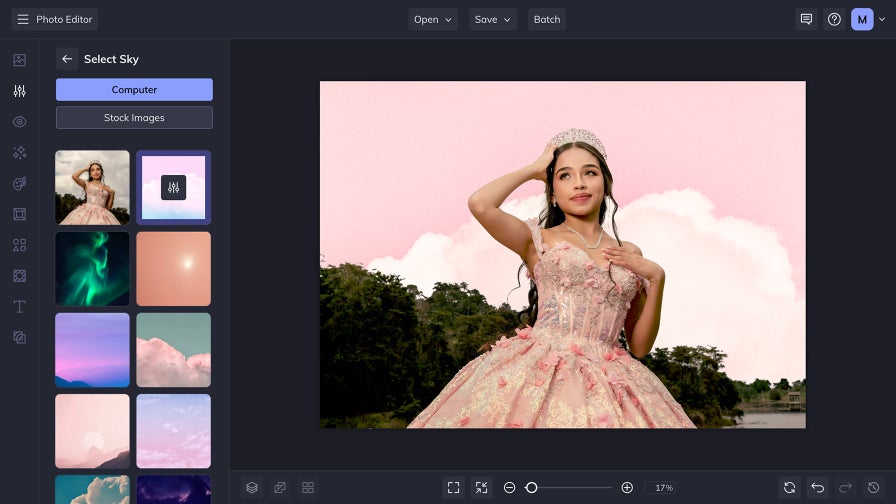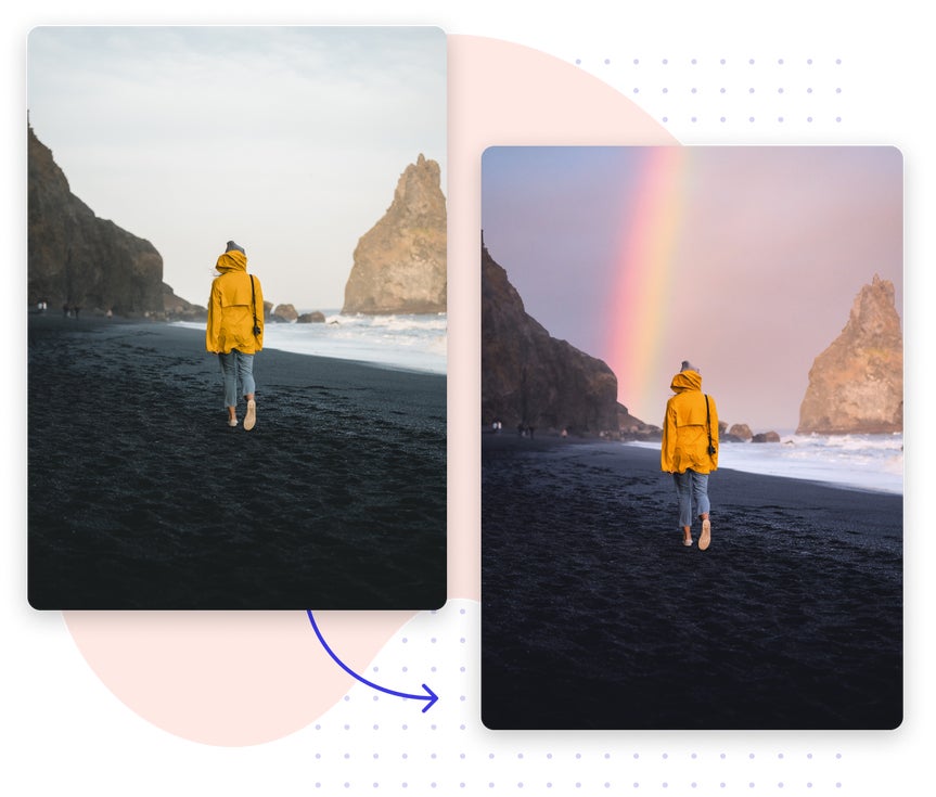 Swap out dull or overcast skies with a new sky that improves lighting, balances mood, and adds visual impact to your image. With BeFunky’s AI Sky Replacer, sky replacement is fully automatic – the tool detects the sky area in your photo and blends in a replacement sky that feels naturally lit and professionally finished. Choose from a curated library of blue skies, sunsets, golden hours, and starry nights, or upload your own to match your creative vision. Whether you’re refining portraits, updating product images, or refreshing travel photos, you’ll get results that look polished and intentional in a few seconds. It's that simple.