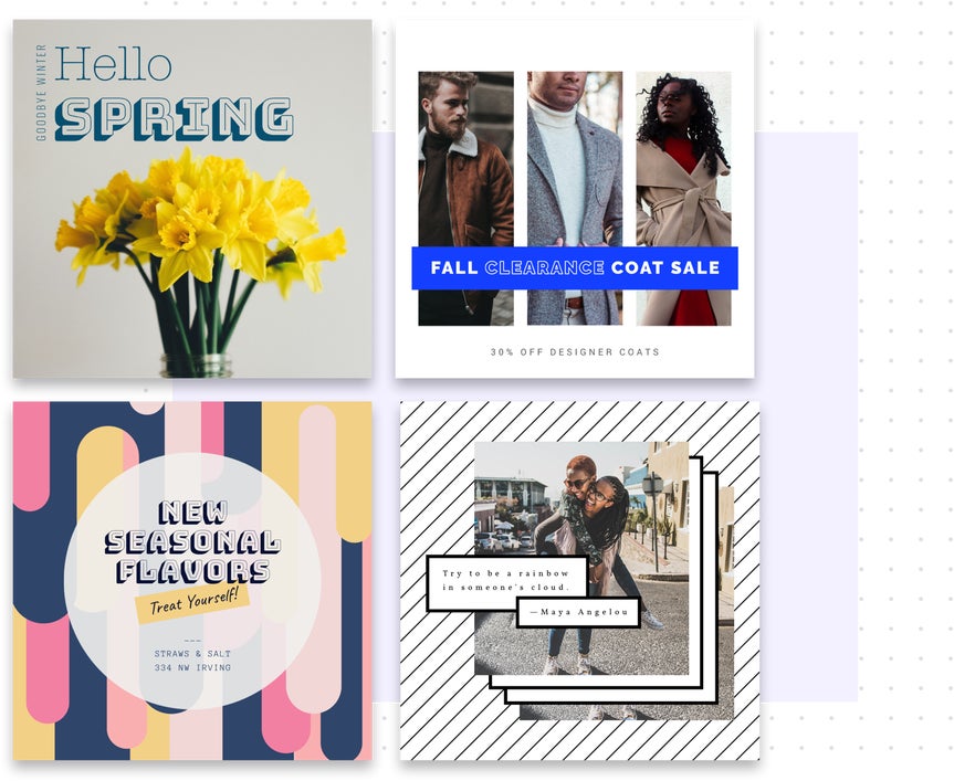 Instagram is more than just selfies and cat videos. It’s also a powerful tool for growing your brand and informing your followers of upcoming events and promotions. To help grab your audience’s attention, try our professionally pre-designed Instagram templates. Don’t have any graphic design experience? No problem. With our customizable Instagram Post templates, it couldn’t be easier to create professional-quality social media graphics on your own, in minutes. We’ve even got you covered with the perfect Instagram Story templates to match, so you can create a branded experience your followers will love!