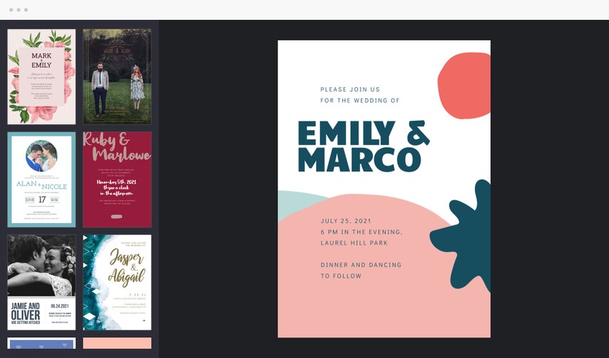 Your wedding is the ultimate celebration of your love story – one that is so unique to you and your soon-to-be spouse. When you create your own wedding invitations, you get to share that story in a way that’s one-of-a-kind. Our Wedding Invitation Maker gives you all the design templates and tools you need. Just choose your favorite template as a starting point, whether it be an elegant wedding invitation, a more rustic design, or one of the many styles in between, and make it your own in just a few clicks.