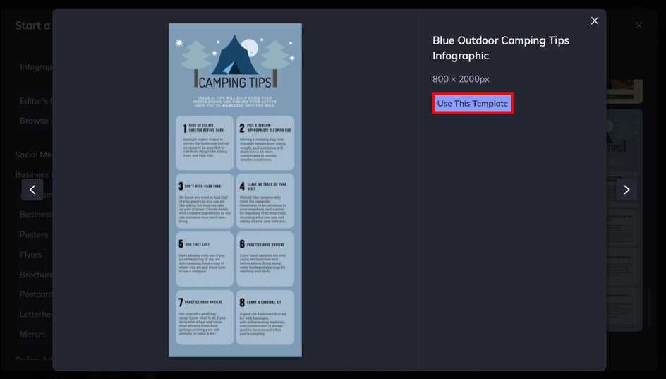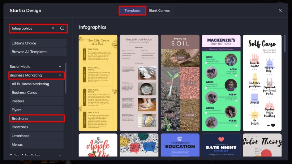 Within the Graphic Designer’s Template Library, you have the choice of either customizing an Infographic or Brochure template for your step-by-step guide. For this example, we’re using an Infographic template. Simply type “Infographic” into the search menu on the top-left of the screen to locate these. To locate the Brochure templates, navigate to Business Marketing > Brochures.