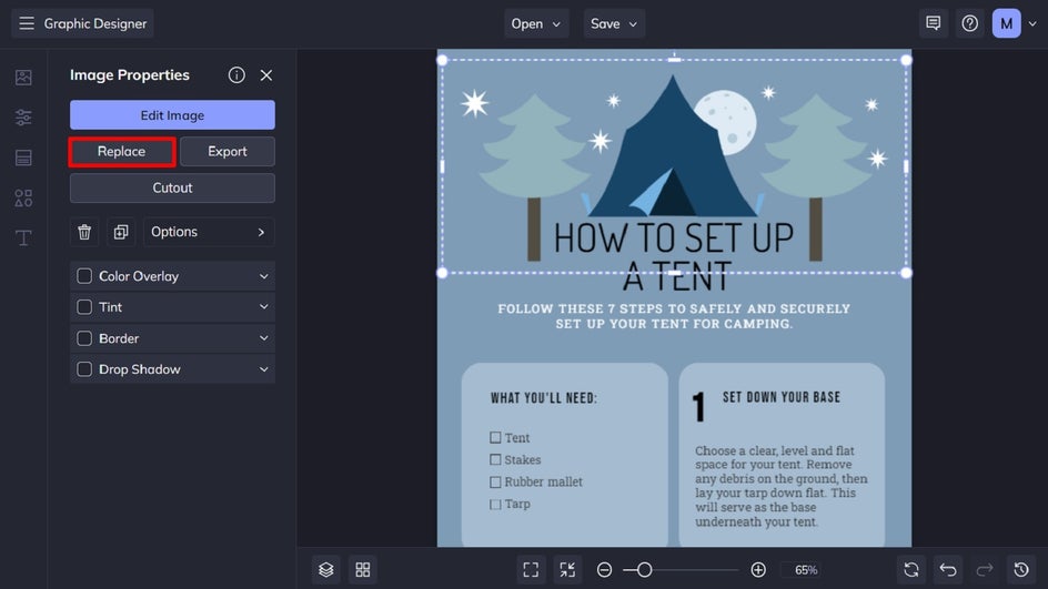 If your step-by-step template contains imagery, such as photos, you can easily swap these out to match your own content. Just click the existing photo, followed by Replace from the Image Properties menu.