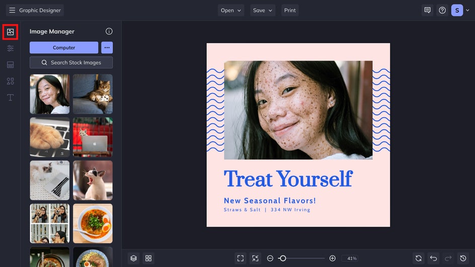 To add your own images to the design, head to the Image Manager tab to drag and drop them onto the template placeholders. You can skip this step if your template doesn't include images.
