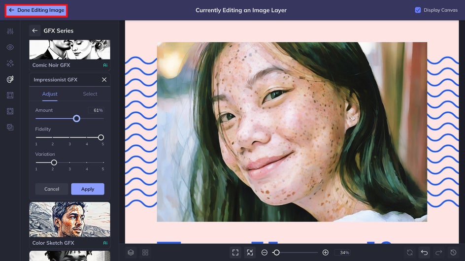 From here, you're free to use whichever effects you like! This design will be used as a professional Instagram post, so we don't want to lose the natural features of our subject. We are creating a social media post for a realtor, so we chose to apply the Impressionist GFX painting effect with a lower tolerance to add some creative flair while maintaining professionalism.