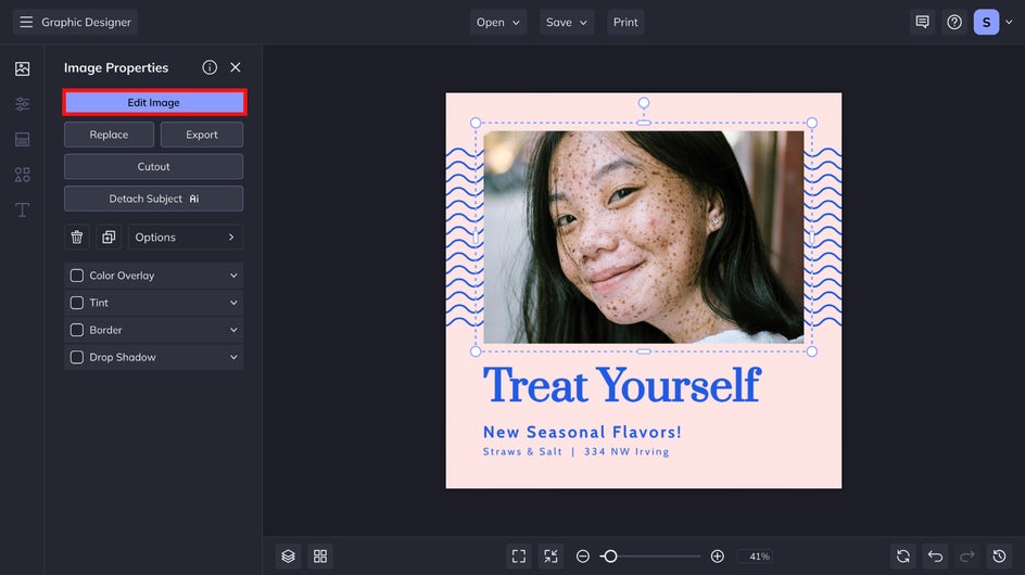 Next, let's edit our image by opening the Photo Editor from the Image Properties menu. Click on your photo to access this menu and select Edit Image.