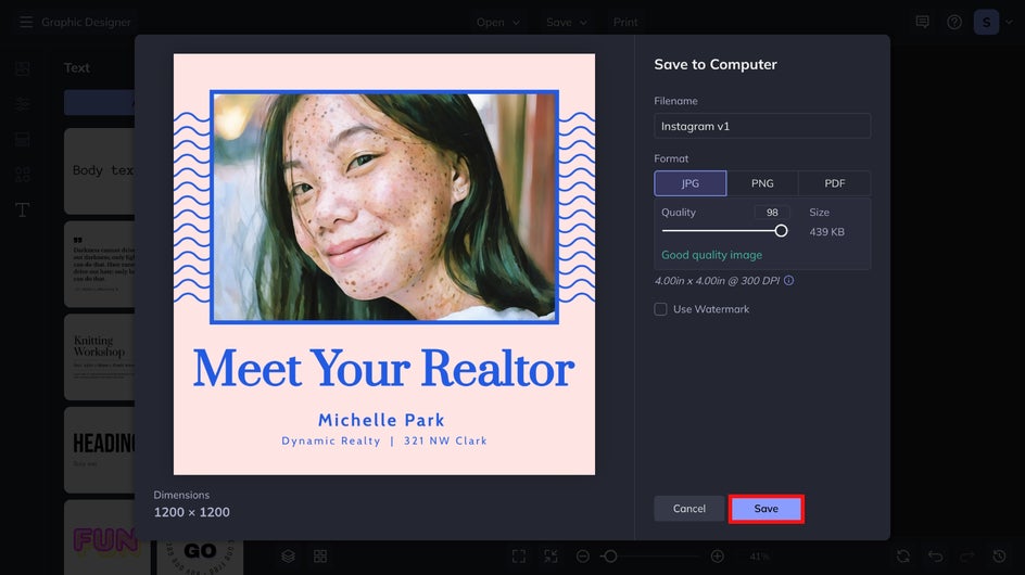 Finally, click on the Save button at the top of your canvas. The format will depend on whether you're looking to print or post your print online.