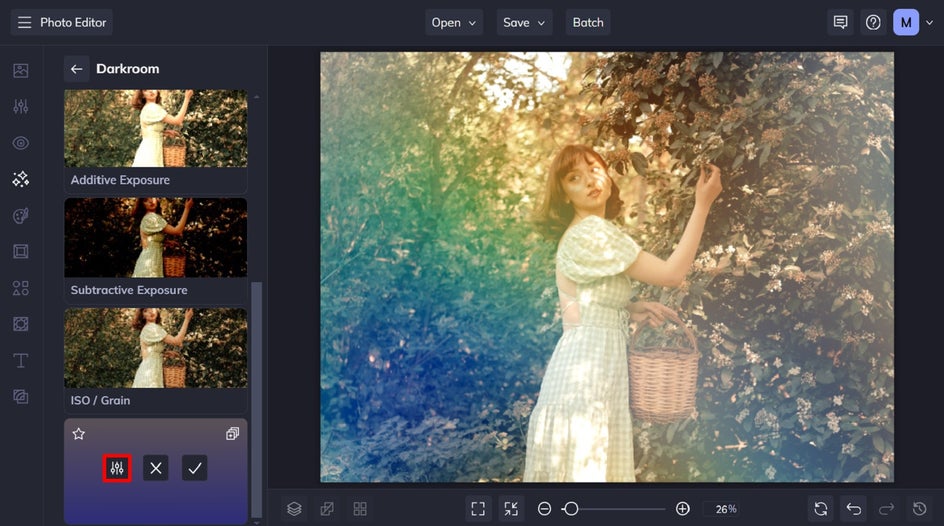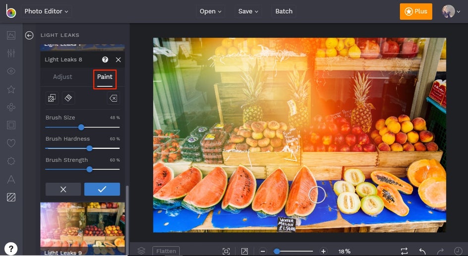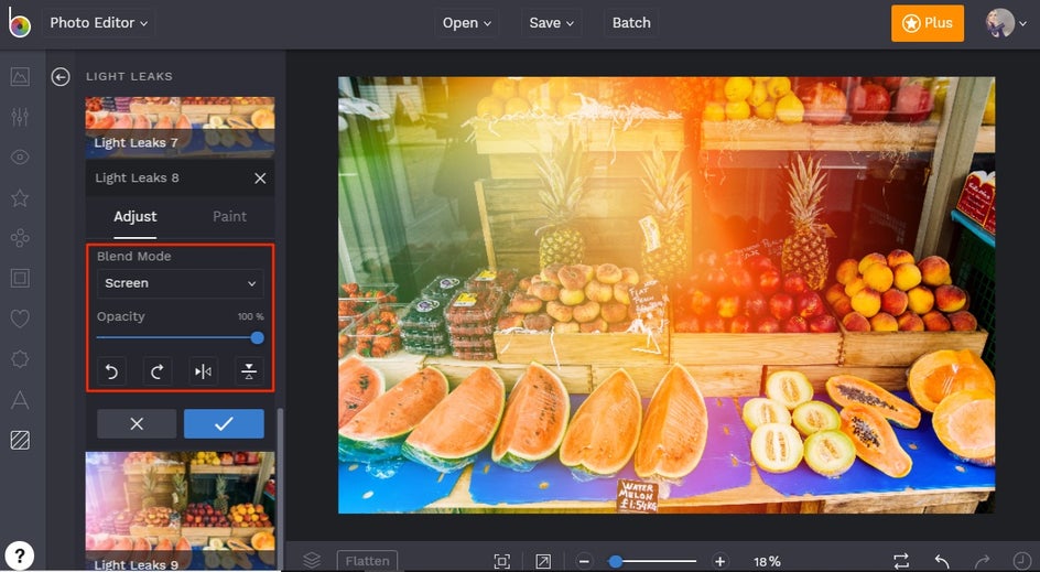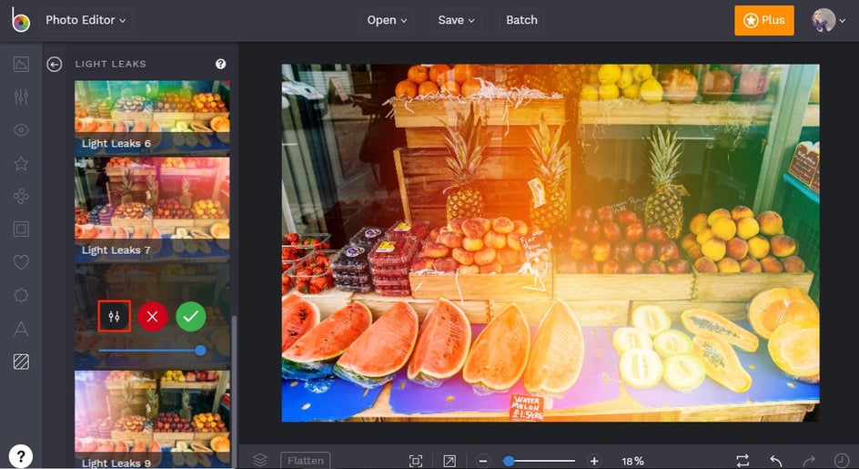 You’ll notice when you click on an effect that you can sample on your photo. You can apply the light leak as-is by clicking on the checkmark icon. Alternatively, click the leftmost icon to open the Settings menu.