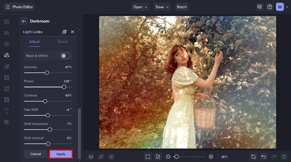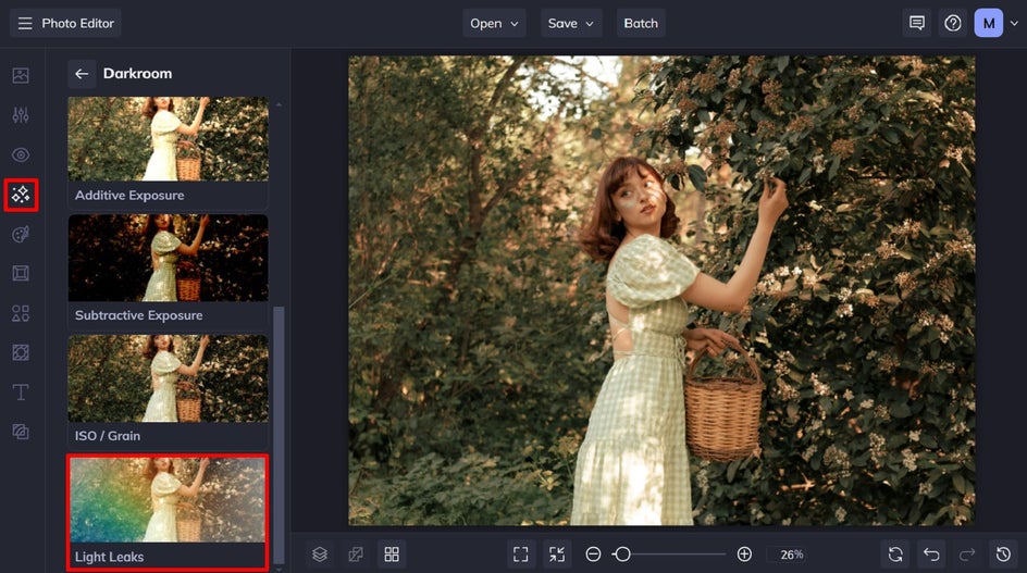Now, with our Darkroom effects, you can recreate this film-inspired look in just a few clicks. This new category is designed to mimic the manual process of film development, giving your digital photos a raw, artistic feel. Want to add a light leak to your own photo? Keep reading, because we’ll show you how!