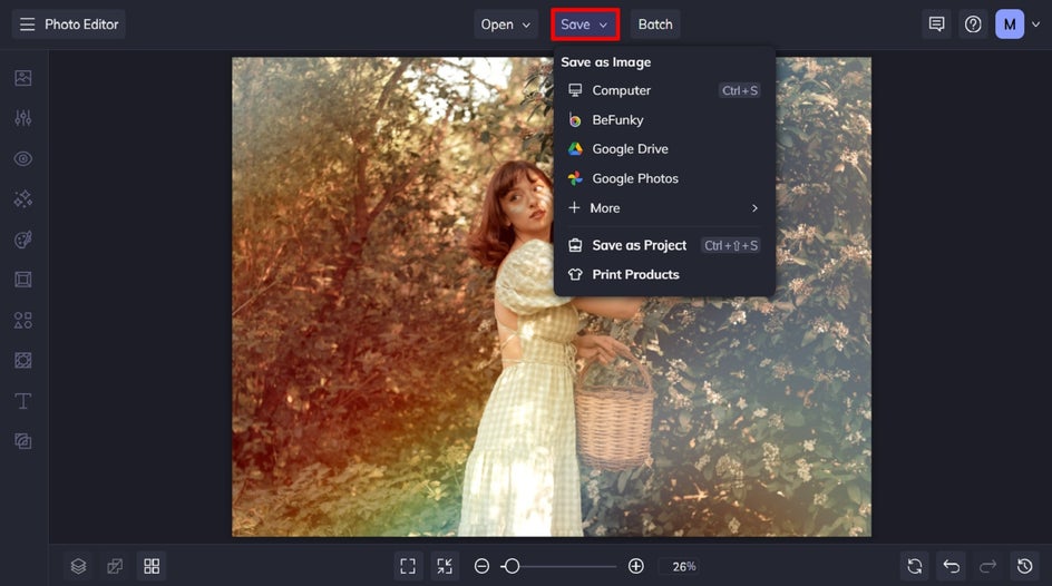Finally, it's time to save your digital light leak effect. Click Save at the top of the canvas, followed by your desired save location and format.