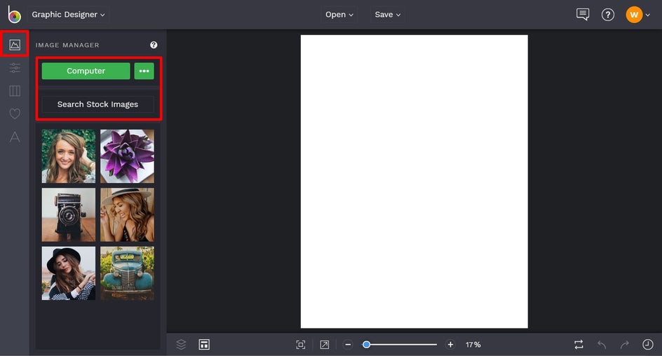 The first thing you’ll want to do with your agenda template is to choose a background image or color for it. If using an image, navigate to Image Manager in the main menu on the left. Clicking the green button featuring three dots will let you upload your image from your BeFunky account, Facebook, or Google Photos. To upload an image from your computer’s files, just click the green Computer button.