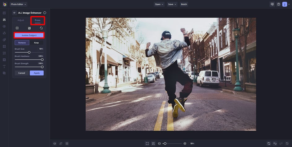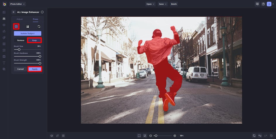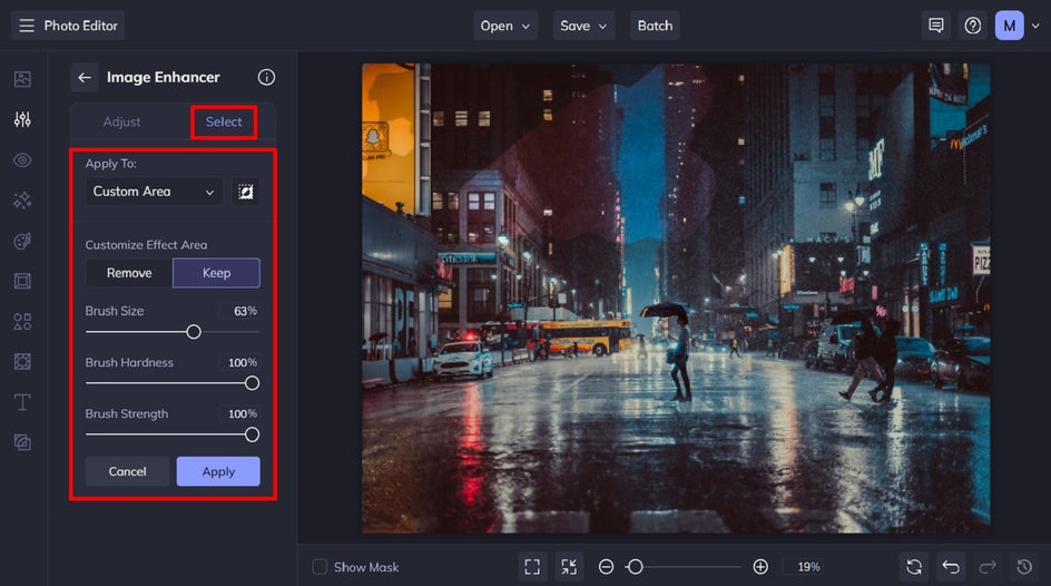 Within the Customize Effect Area section below, you have several additional options which allow you to ‘paint on’ your desired image enhancement effect. For example, you can adjust the sliders underneath Brush Size, Brush Hardness, and Brush Strength to customize the tool to your needs. You can also toggle between the options to remove or keep the effect while using the Select options.