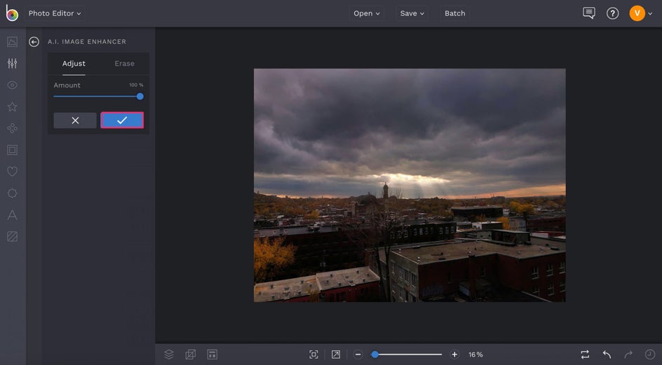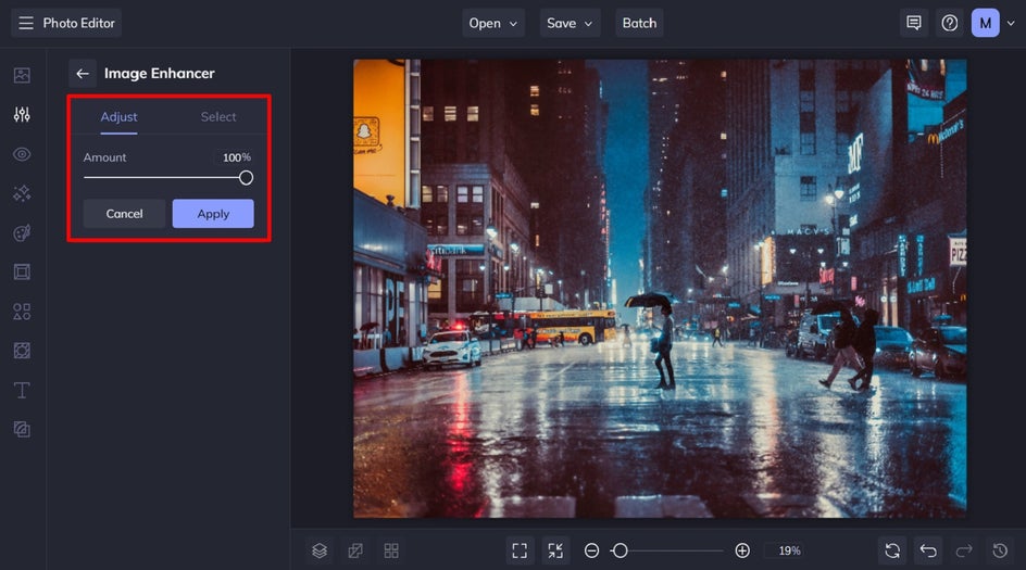 When you access the AI Image Enhancer, the tool will instantly enhance your entire image. You can then use the Amount slider to increase or decrease the effect for your desired look.