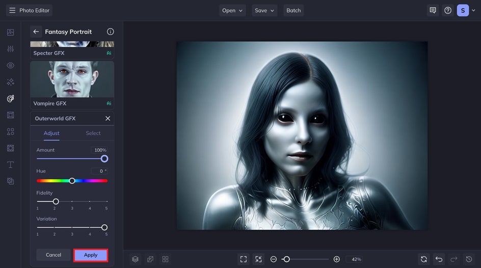 Next, select Outerworld GFX and watch as the AI effect is applied in a matter of seconds. If you're content with the transformation as-is, click the Apply icon. Otherwise, follow along for more ways to customize your extraterrestrial portrait.