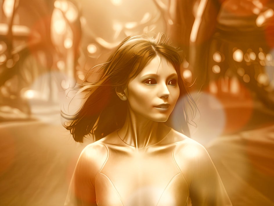Apply a soft Bokeh texture to set the scene of your portrait! Our Outerworld filter also affects the background of your image. It's fun to see what kind of landscape the AI will come up with, and pairing the new background with a glowing bokeh effect makes the scene seem real and lived in. Our subject here appears to be in an out-of-this-world cityscape, and the warm tones complement the metallic shine of the Outerworld effect.