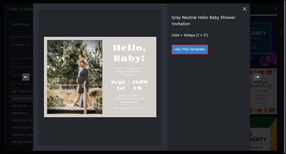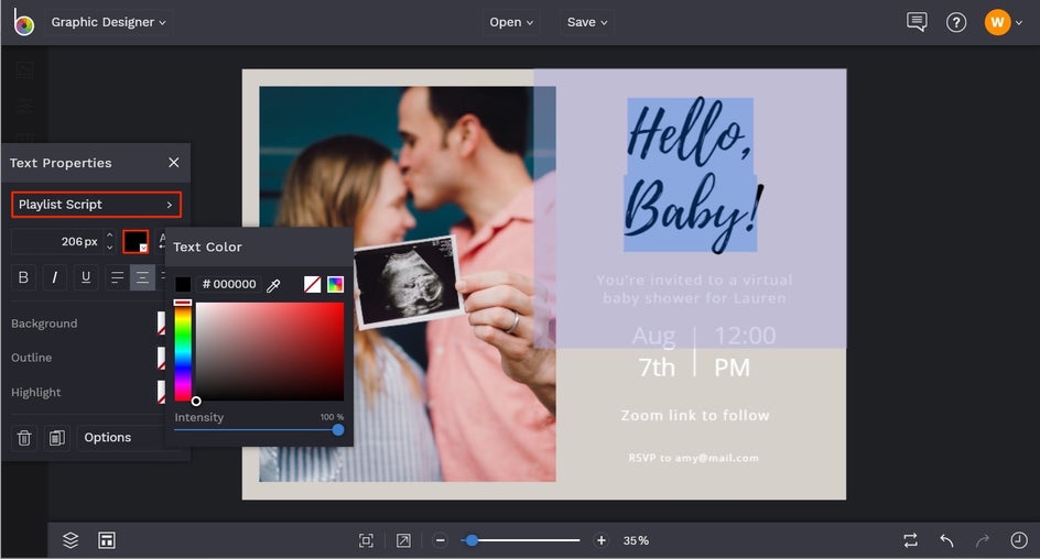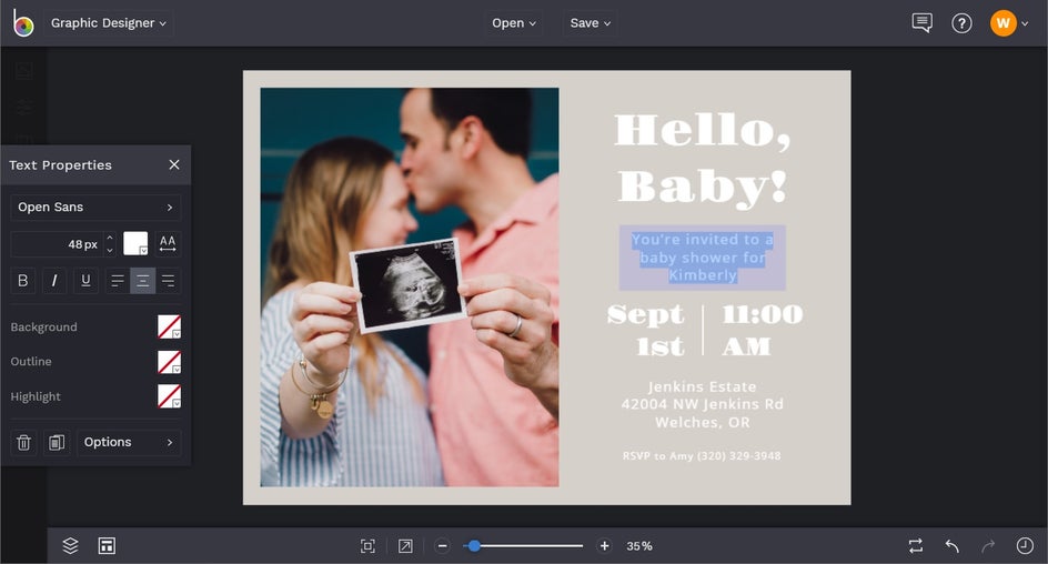 Once you have your image squared away, it’s time to edit your template’s existing text to reflect the details of the virtual baby shower. Click on any text box and type what you want it to say.