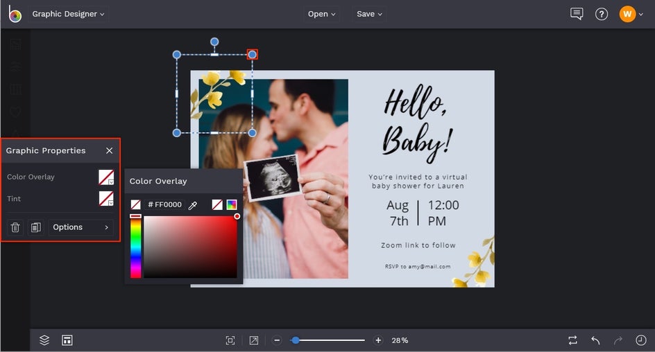 Once you've exited the Graphic Library, you'll find all of the graphics you selected in the Your Graphics section of the Graphics tab. Simply double-click or drag-and-drop them onto your invitation template to position and resize them. You can also use the Graphic Properties menu that appears to customize the Color Overlay, Tint, Blend Mode, Opacity, and more!