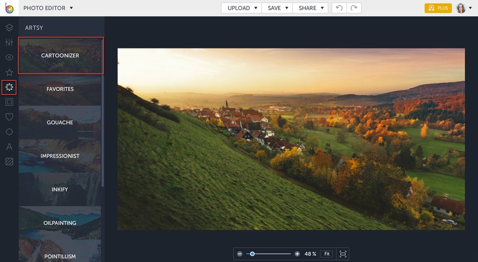 To get started with our Cartoonizer, first, you'll want to upload your photo into the Photo Editor and boost the Contrast, Sharpness and Saturation to make it pop. Next, head to the Artsy section, scroll through our unique photo-to-art effects and select Cartoonizer. Then try out all of the different options and play around with the controls until you get your photo to the point of perfection. The Cartoonizer’s multiple filters guarantee a unique touch to make your edits truly one of a kind.