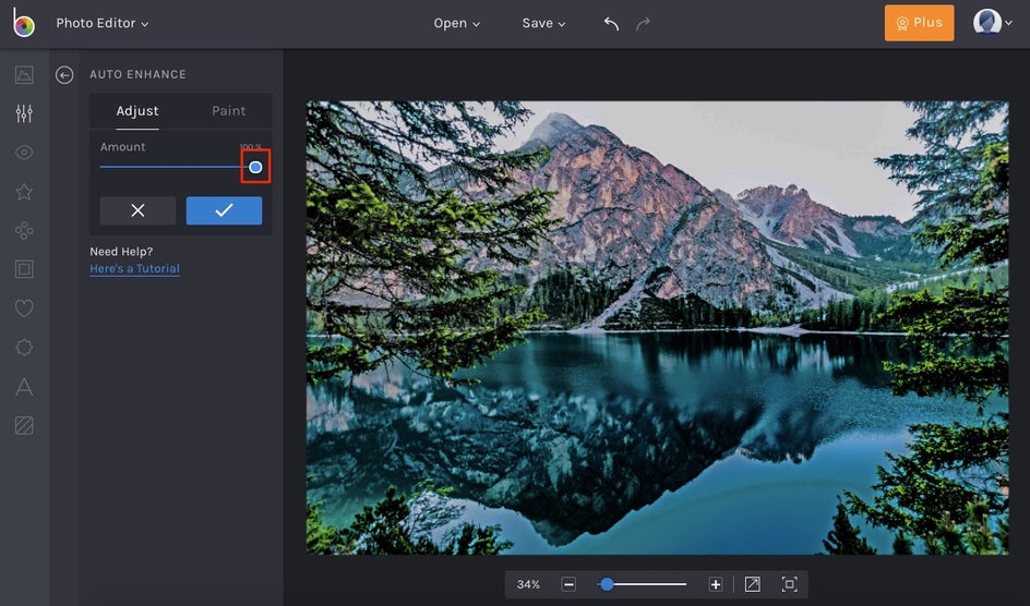 Under Adjust, you can control the Amount of Auto Enhance that's applied to your photo by dragging the blue circle to the left or right. With a one-click solution for improving your photos, our Auto Enhance is as easy as it gets; but we make sure you always stay in control.