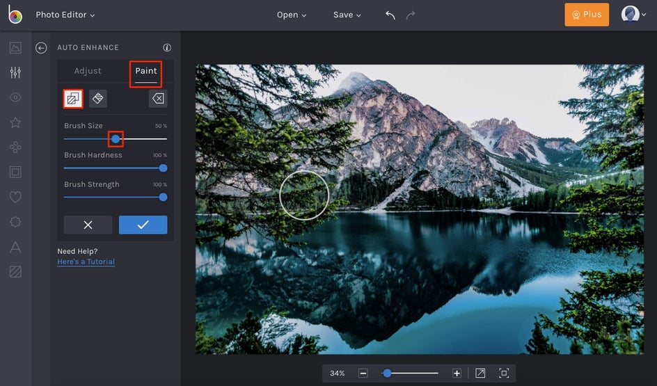 To selectively apply Auto Enhance to a specific part of your photo, click on the Paint tab. Then adjust Brush Size, Brush Hardness, and Brush Strength to create a custom paintbrush, and apply Auto Enhance only to the areas that need it.