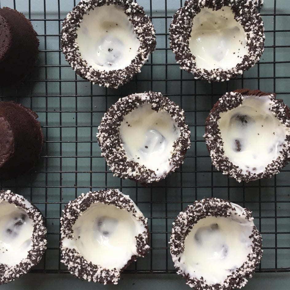 8. While cups are cooling, melt white chocolate in a large glass bowl in 30 second bursts in microwave. Stir between each burst until totally melted and smooth. Working quickly, pour about 2 tablespoons of white chocolate into each cup, and swirl and tilt to coat evenly, then dip tops into crushed cookies or sprinkles.