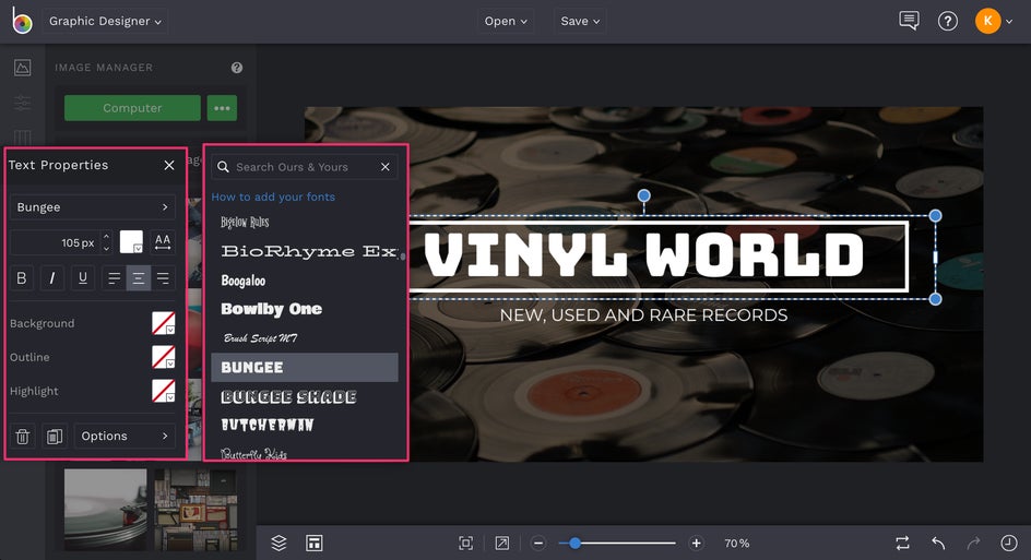 Once there, you can click the Computer button to search your files or the Search Stock Images button to search over a million free stock photos to use in your design, right from the Graphic Designer.