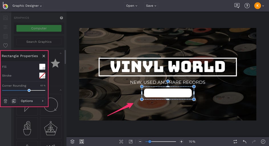 Be sure to add your call to action button for the best impression results. If your template doesn’t have one already added to it, select the Graphics tab in the left-hand menu. Select the Rectangle to add it to your canvas and size it properly by clicking and dragging the corners towards the center of the rectangle.