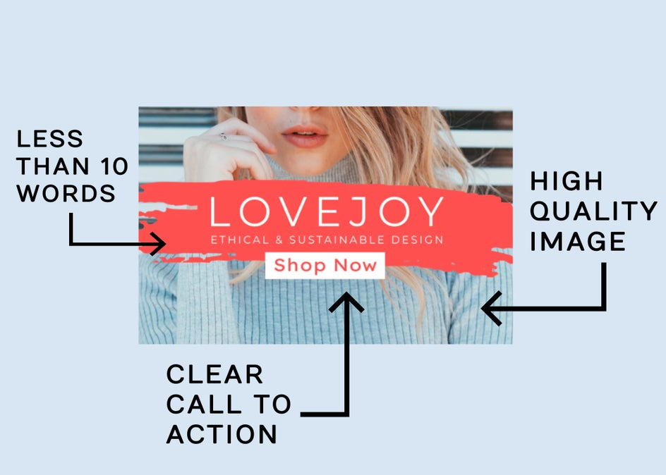 Your call to action button is your final instruction to the consumer. The clearer your message, the better. Use strong, clear CTAs like “Learn More,” “Shop Now,” and “Limited Time Offer.”
