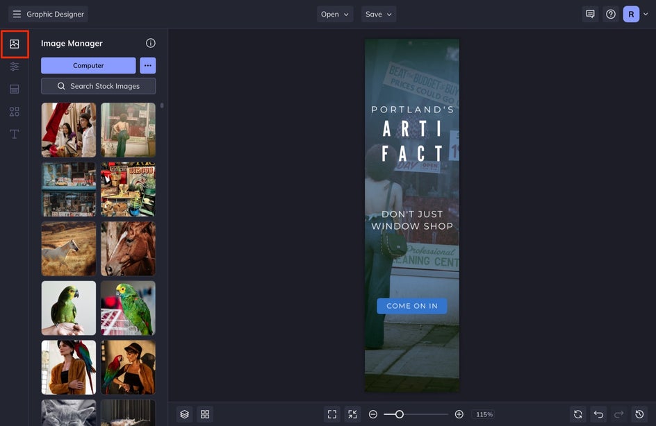 Replace the current image with a high-quality photo of your choice. Whether you’re looking to use a free stock photo in your banner ad design or you want to use one from your own files, click on the Image Manager tab in the left-hand menu.