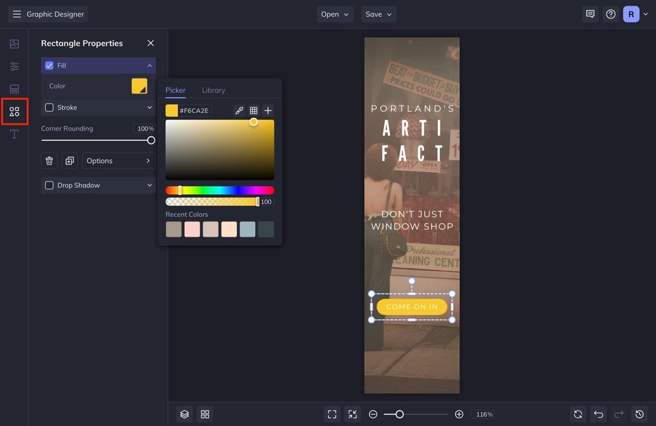 Once sized, with the rectangle selected, adjust the Corner Rounding in the Rectangle Properties menu that appears. Adjust the color by selecting the Fill option and choosing a new color swatch.